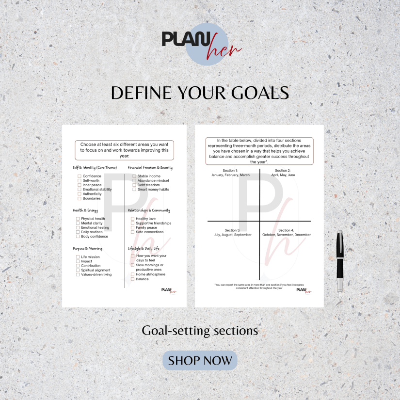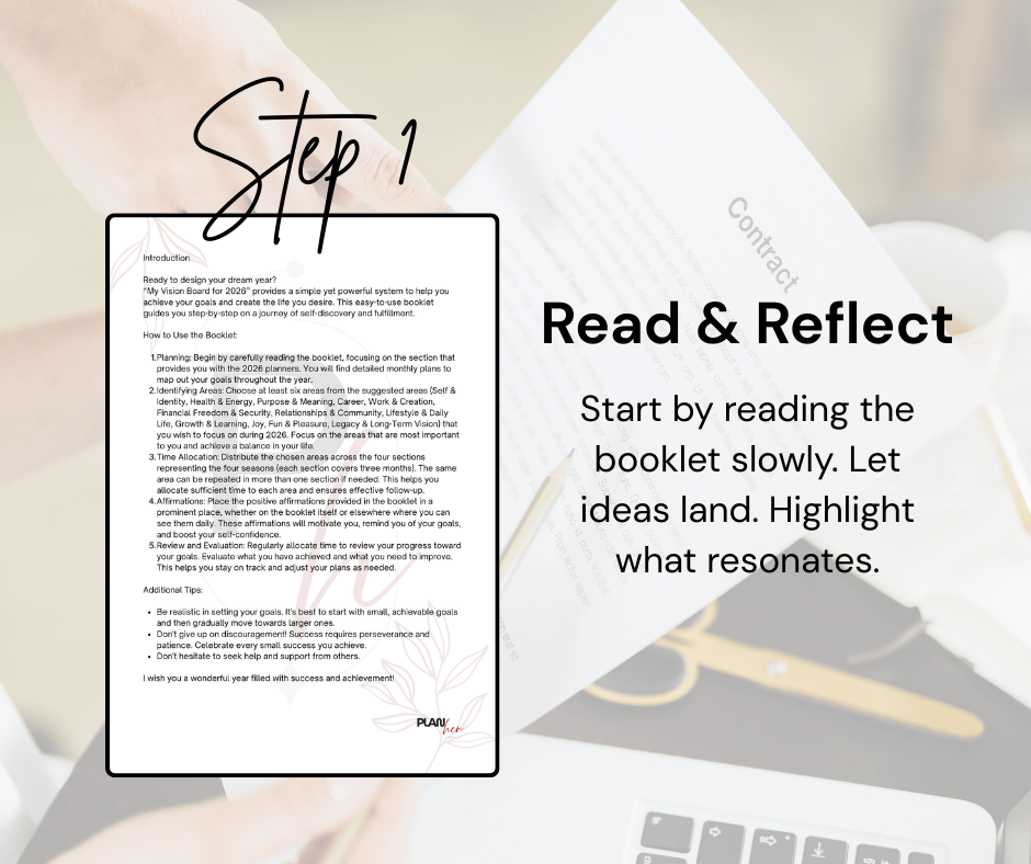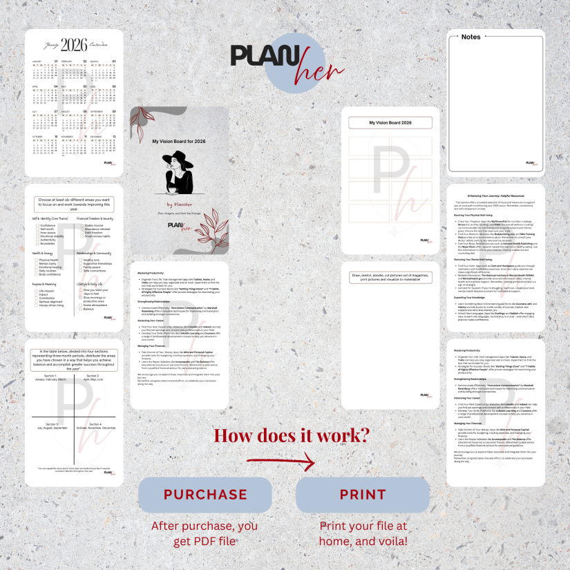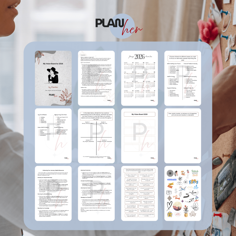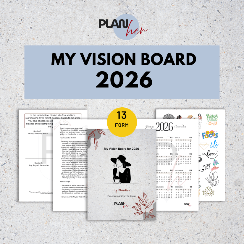 With the My Vision Board for 2026 by PlanHer Studio, you’re not just visualizing a dream—you’re planning a transformation. This guided vision board booklet was created to help you imagine, plan, and start the change in a grounded and empowering way.