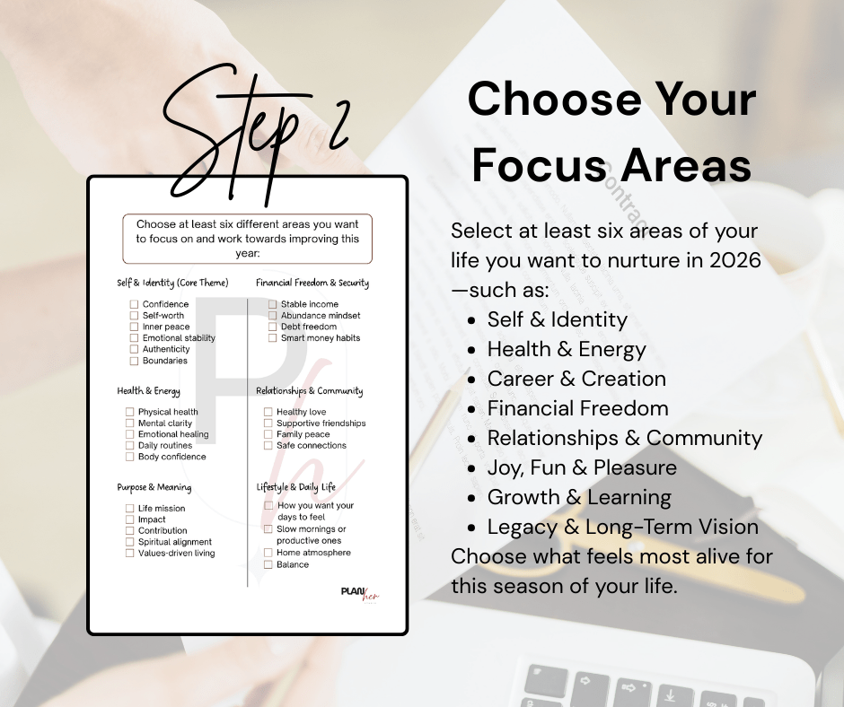- Focus on balance: The booklet encourages selecting at least six life areas (such as Self & Identity, Health, Career, Relationships, Financial Freedom, Joy, and Purpose). This ensures your growth is holistic—not one-sided.